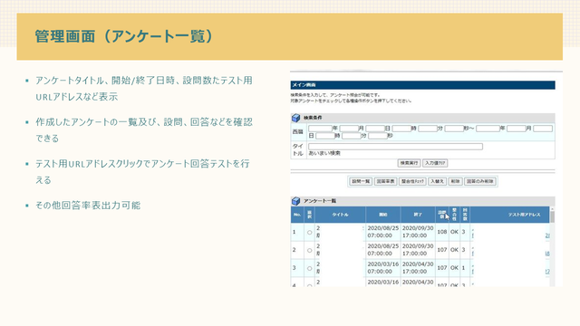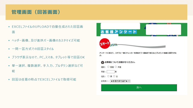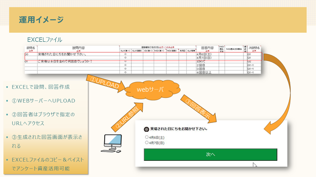 ・EXCELで作成したアンケートを、即時にUPして回答画面を作成できる。